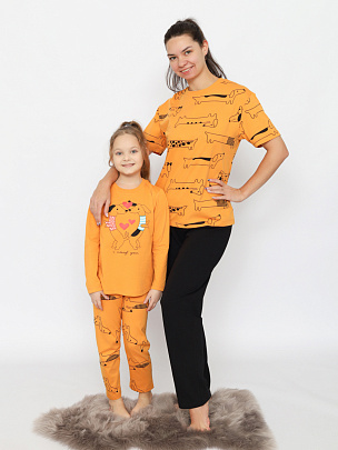 Комбинированная пижама из джемпера и брюк. Джемпер гладкокрашенный, свободного покроя с длинным рукавом. Горловина обработана притачной бейкой из рибаны с лайкрой. Перед оформлен принтом. Прямые брюки умеренного объёма выполнены из набивного полотна. Цельнокроенный пояс обработан плоским швом вподгибку с одновременным прокладыванием резинки.