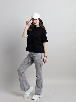 Футболка оверсайз из натурального хлопка. Со спущенными плечами, коротким рукавом. Круглая горловина обработана узкой притачной обтачкой из рибаны с эластаном. Полочка декорирована вышивкой в тон. Длина выше бедра.
