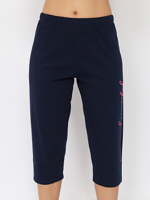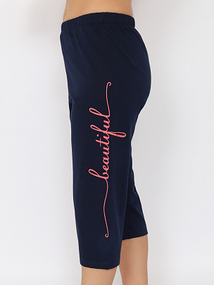 Гладкокрашенная пижама из джемпера и бридж. Джемпер свободного покроя с рукавом 3/4. Горловина обработана притачной бейкой из рибаны с лайкрой. Перед оформлен принтом. Бриджи прямые умеренного объёма длиной ниже колена выполнены из полотна дополнительного цвета. Цельнокроенный пояс обработан плоским швом вподгибку с одновременным прокладыванием резинки. На левой стороне - принт.