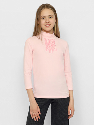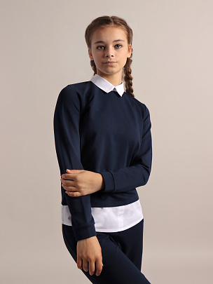 Джемпер с длинным втачным рукавом и манжетами. Манжеты, воротник и пояс выполнены из полотна с добавлением эластана. В горловине расположена эмитация рубашки с отложным воротником и стойкой.