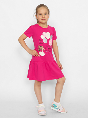 Платье для девочки отрезное по линии ниже талии. Юбка со сборкой по шву притачивания. Рукава короткие, со сборкой по окату. Горловина обработана узким воротником из полотна с эластаном. Перед платья декорирован принтом c объемной вышивкой "suzine" "Пусть летят твои мечты".