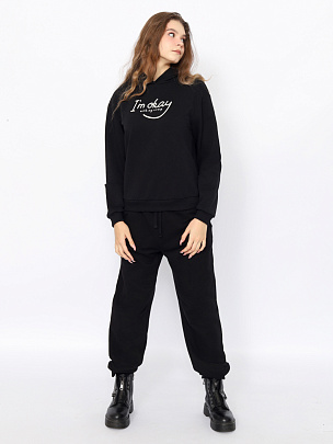 Толстовка для девушки с капюшоном и длинными рукавами из плотного трикотажа без начеса. Рукава с манжетами по низу. Притачной пояс и манжеты выполнены из полотна с эластаном. Перед толстовки декорирован принтом (я в порядке).